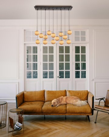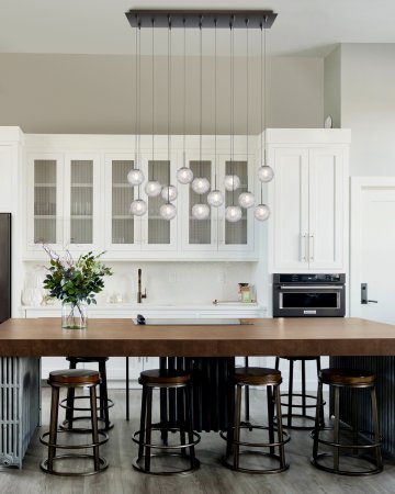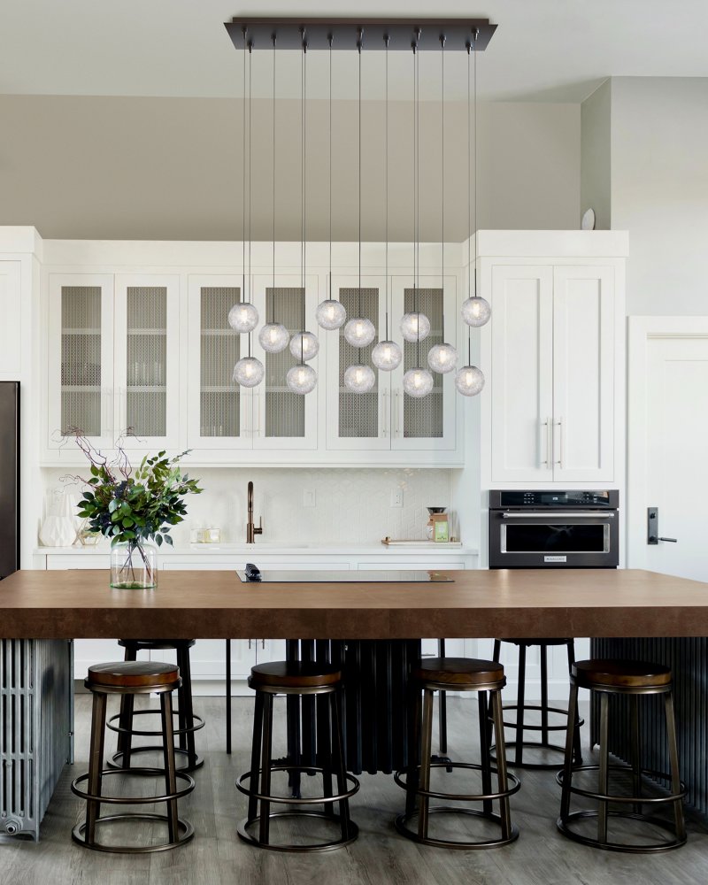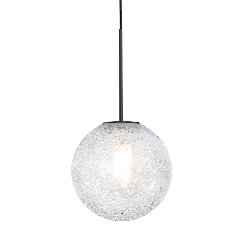 Hand-crafted glass globes in Amber, Alabaster, Latte or Clear color radiate warmth and visual intrigue.